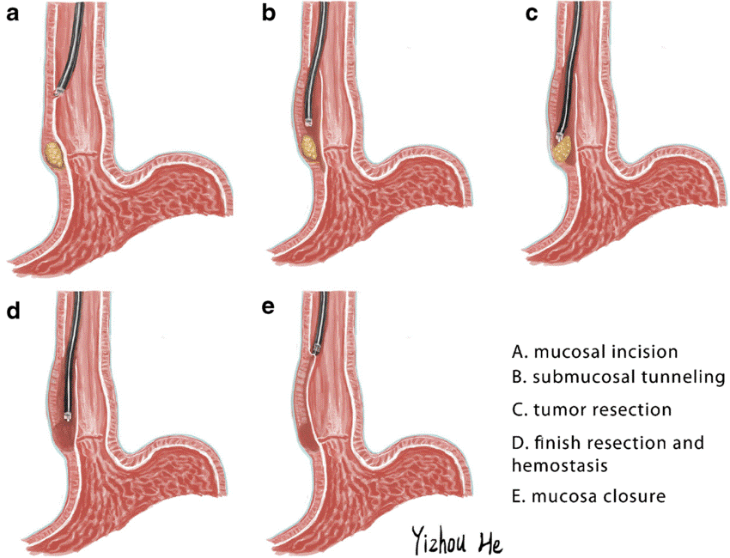 The tumor is then cut from the muscle layer and removed through the tunnel. Afterward, the entrance to the tunnel is closed and the procedure is finished.